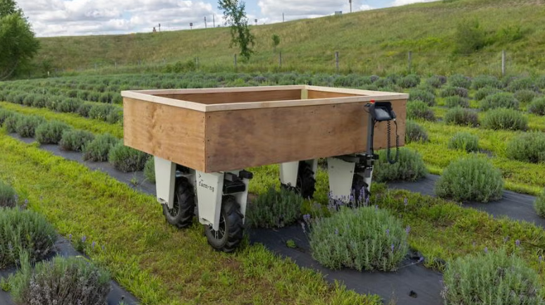 The Amiga robot, by Farm-ng, is a battery-operated micro-tractor designed for 24/7 automation in specialty crop farming. The all-terrain, all-weather robot can be used as a scouting robot in the field, programmed for pest and disease control; for weeding or harvesting of specialty crops, such as lavender or berries; and to capture real-time images at ground level, with a mounted vision sensor camera.