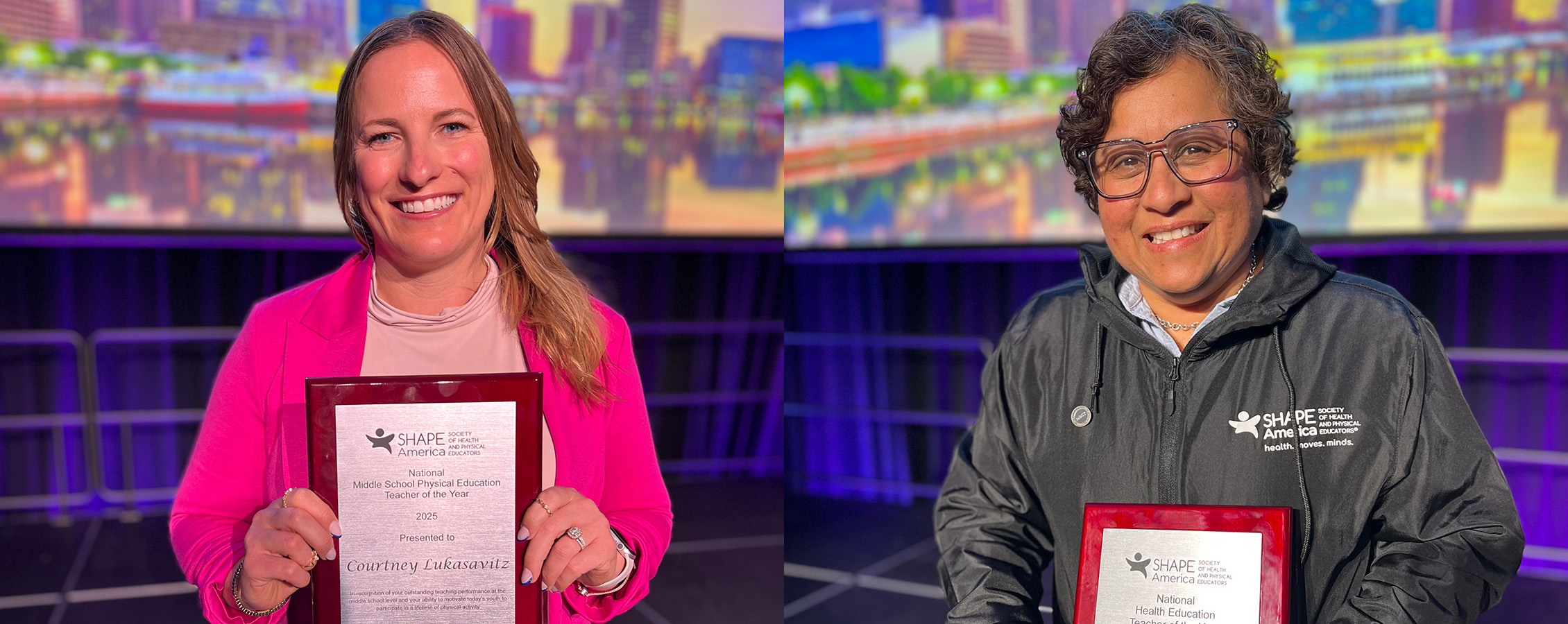 Courtney Lukasavitz, a physical education teacher at Indian Community School in Franklin, Wisconsin, was named Middle School Physical Education Teacher of the Year, and Sandee Ortiz, a health education teacher at Sun Prairie West High School in Sun Prairie, Wisconsin, earned Health Education Teacher of the Year honors. Both Lukasavitz and Ortiz are National Board Certified (NBCT) — something only 3 percent of teachers nationwide can claim.