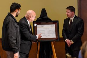 UW System President Cross, center, presents Regent President Behling with a framed gift honoring Behling’s role in the UW System forming a partnership with the University of Nizwa, in Oman. Standing at left is Sulaiman Al Kindi, visiting nephew of Abdul Aziz Al Kindi, vice chancellor of University of Nizwa.