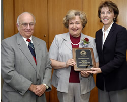 UW-Milwaukee's Pamela Fendt accepts her 2004 Academic Staff Excellence Award from Regent President Toby Marcovich and Regent Gerard Randall. (Jay Salvo)