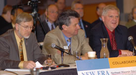 A NEW ERA panel including UW-Green Bay Chancellor Bruce Shepard, UW-Fox Valley Dean Jim Perry, and Northeast Wisconsin Technical College Jeffrey Rafn talked about all that the collaboration has accomplished in its six-year history to, as Shepard said, “better meet the educational needs of this region” by making it easier for students to move between two- and four-year UW campuses and technical colleges.