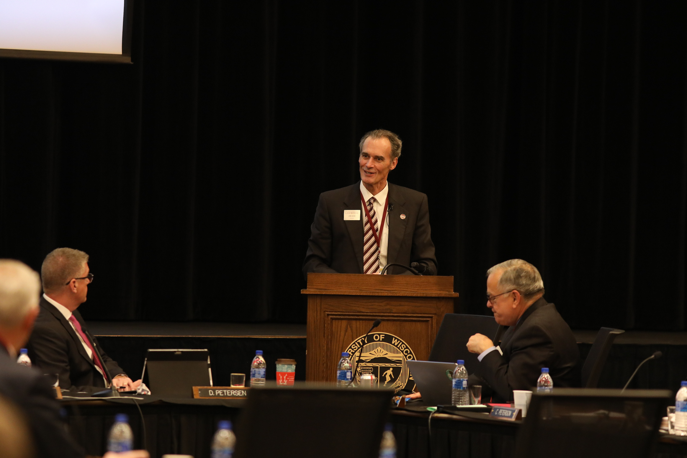 Governor-elect and current Regent Tony Evers briefly addressed the Board, calling the UW System one of the most important “economic drivers and drivers of democracy” in Wisconsin. “It’s a value-added enterprise,” said Evers, who served 9½ years on the Board.