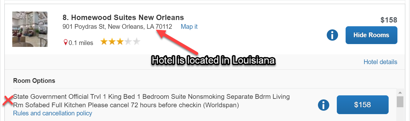 You may also see the option for a State Government rate outside of Wisconsin. It is important to review the Rules and Cancellation policy. State Government Rates are generally only for employees who work in the same state that the hotel is located.